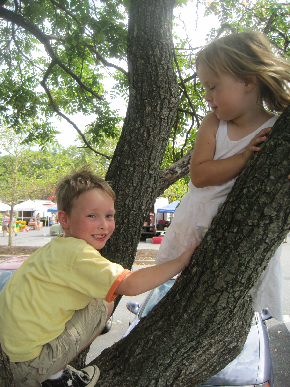 My friend (also a mom of tree-climbers) and I went over to see what was what. The children all came with us, six of them, all a little unsure and wondering what was going to happen. We told them that they were allowed climb in the tree, because all their parents said they could. We told them it wasn’t against the law. We put those who wanted to climb back up in the tree.