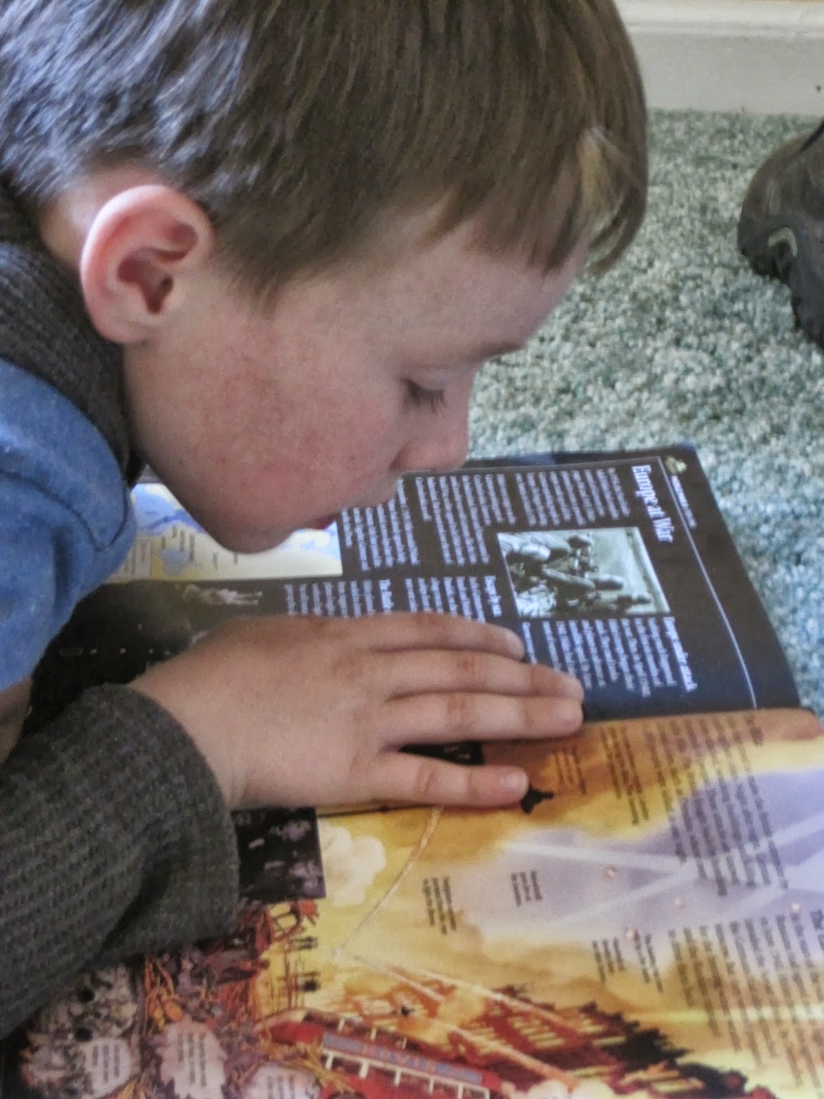 He read two pages about World War II, asking me what things like N-a-z-i and C-z-e-c-h-o-s-l-… and D-u-n-k-i-r-k spelled, and taking in every word even though his supporting background knowledge and geography are pretty hazy because it’s quite an advanced level book of world history.